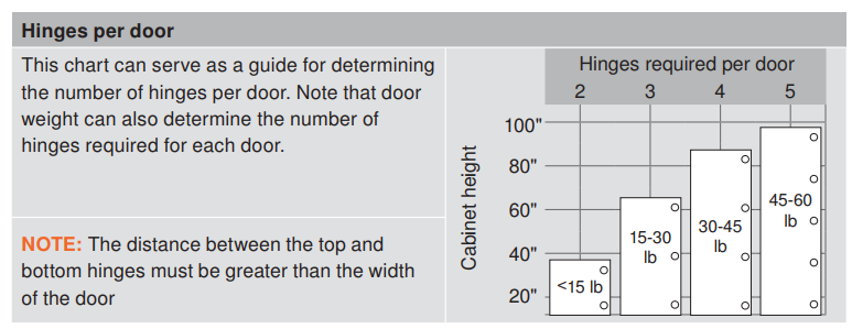 Hello there! Please see the attached photo for the number of hinges per door. For optimal performance, the Blum 155 Degree Clip Top Zero Protrusion Self-Closing, Straight-Arm Hinge, xxxx -On typically requires a specific number of hinges per door, depending on the door size and weight.
